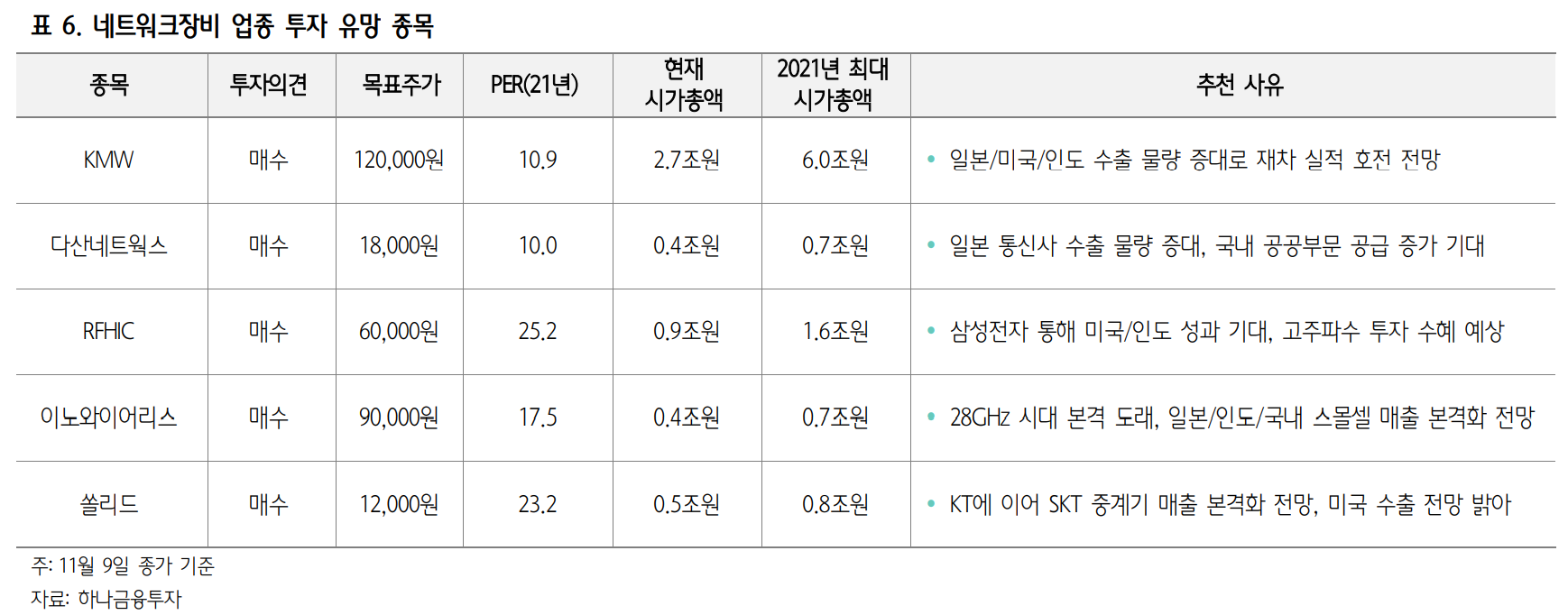 2021년 네트워크장비 업종 투자 유망 종목으로는 KMW/RFHIC/이노와이어리스/다산네트 웍스/쏠리드를 추천한다. 앞서 언급한 것처럼 1등 업체, 미국/인도 수출 수혜주, 삼성/노키 아 벤더, 스몰셀 및 인빌딩 1등 장비 업체, 유선 가입자 1위 업체로 2021년 투자 유망 종목 을 선정하였다. Top Pick 및 관심종목에서 따로 다룰 KMW와 다산네트웍스를 제외한 RFHIC, 이노와이어리스, 쏠리드에 대한 추천 사유는 다음과 같다.