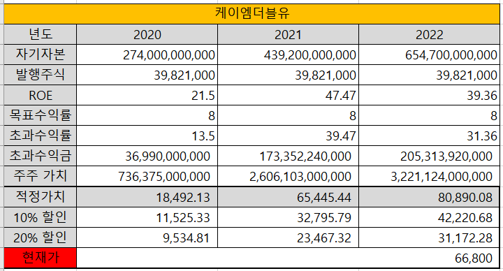 2021년말 예상 초과 수익을 달성 했을때의 적정 주가를 이미 넘어서고 있다.