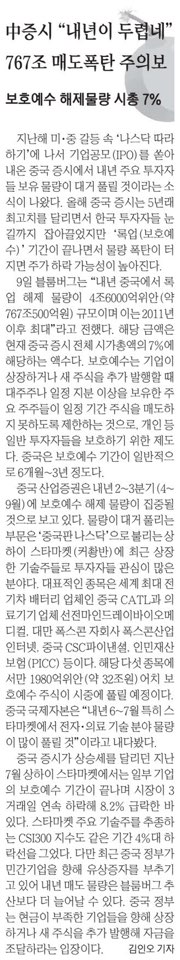중국 산업증권은 내년 2~3분기(4~9월) 에 보호예수 해제 물량이 집중될 것으로 보고 있다.