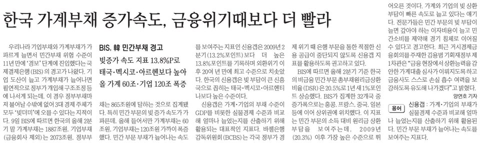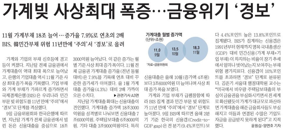 BIS 집계 결과 민간 부문 빚 위험도가 11년 만에 '주의'에서 '경보' 단계로 높아졌다.