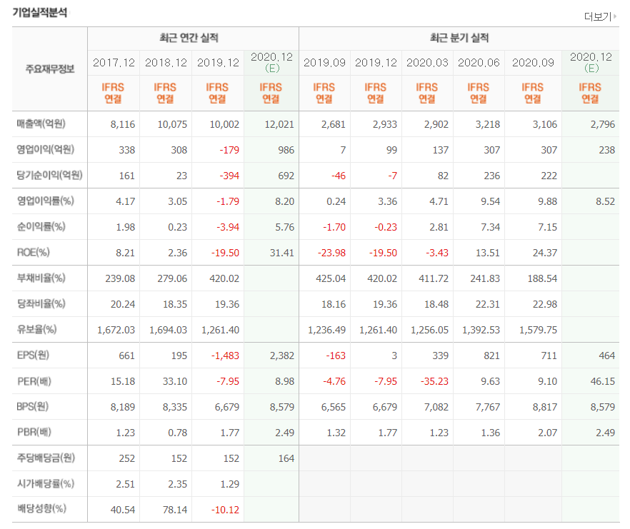 2019년 영업이익 -179억원에서 2020년 986억원(예상)으로 흑자전환
