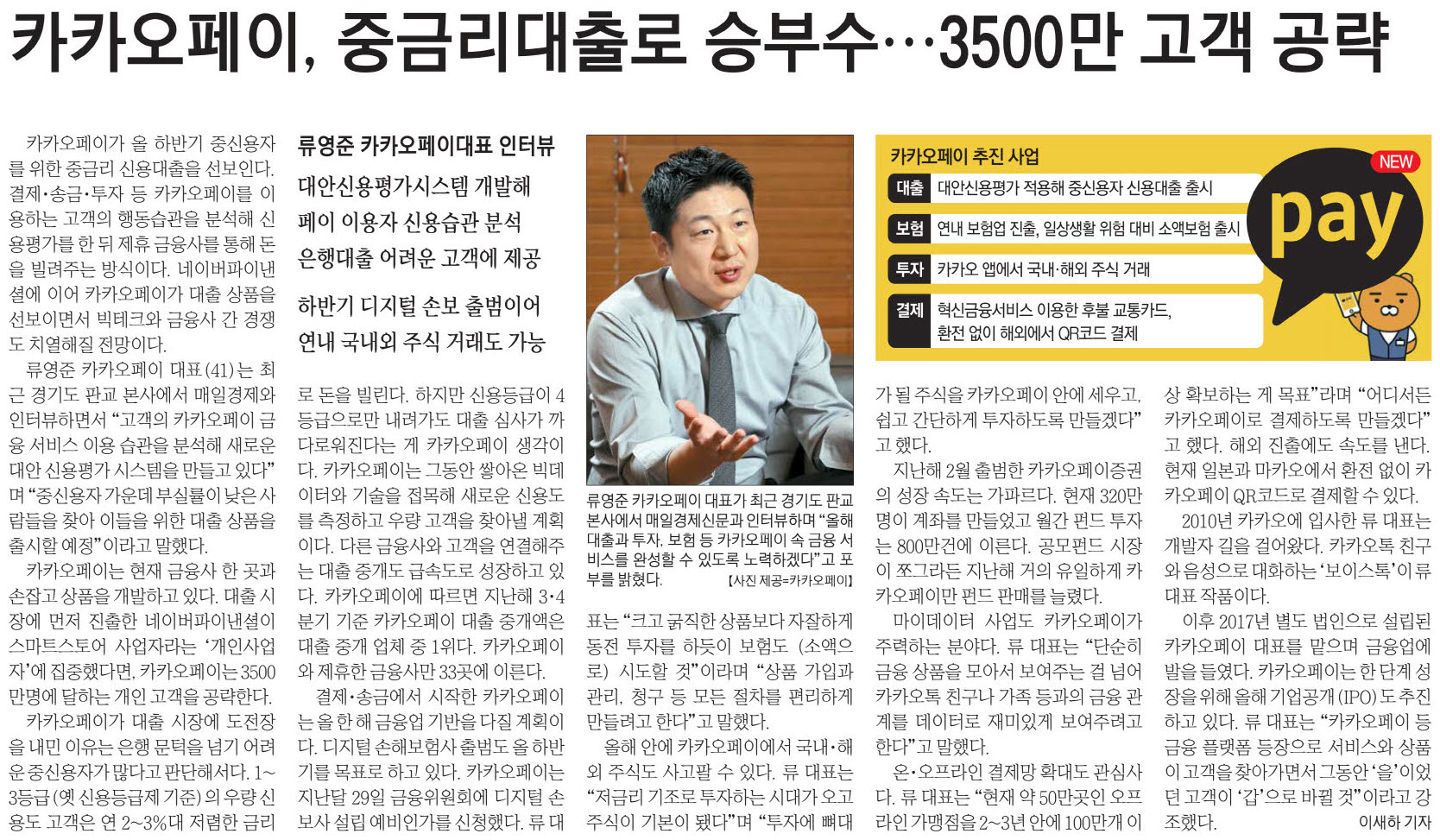 카카오페이는 현재 금융사 한 곳과 손잡고 상품을 개발하고 있다. 3500만명에 달하는 개인 고객을 공략한다.