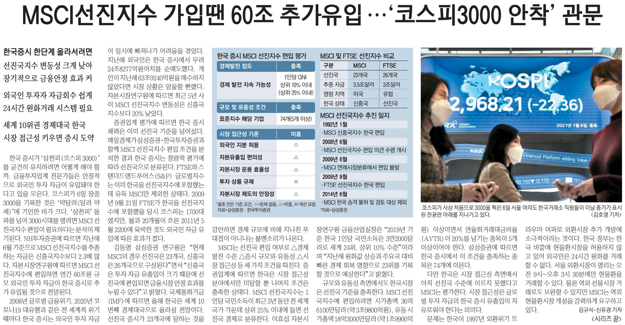 MSCI 선진국지수 편입하면 연간 60조원 규모 외국인 투자 자금이 한국 증시로 추가 유입될 것으로 전망된다.