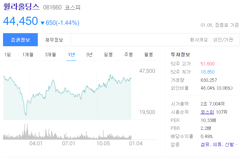 2020년 1월 물적분할을 통해 존속법인 휠라홀딩스와 국내 브랜드 사업을 담당하는 신설법인 휠라코리아로 분할되었음.