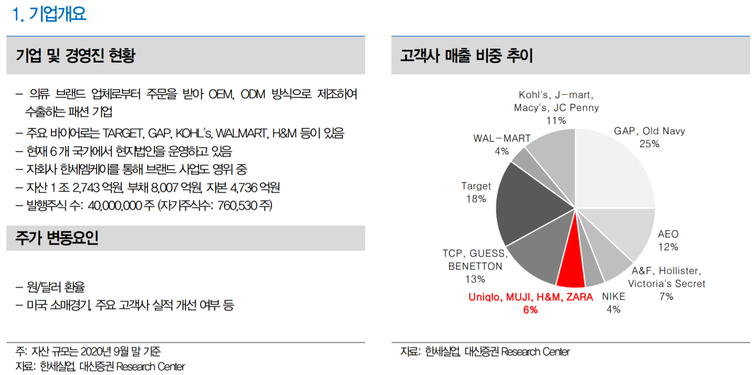 -동사의 업황 변동에 비해 꾸준한 실적을 기록하면서 실적 안정성을 보이는 장점 이 오히려 주가 변동성을 줄여 다른 의류 OEM 기업들에 비해 주가 탄력도는 약 한 상황. 그만큼 주가는 저평가 영역에 머물러 있는데(2021년 기준 P/E 6배 수 준) 이러한 valuation discount는 2021년 양호한 수주 윤곽이 드러나는 시점에 서 빠르게 해소될 것으로 전망