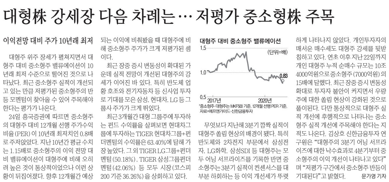 향후 12개월간 예상되는 이익에 비춰봤을 때 대형주에 비해 중소형주 주가가 크게 저평가된 셈이다.