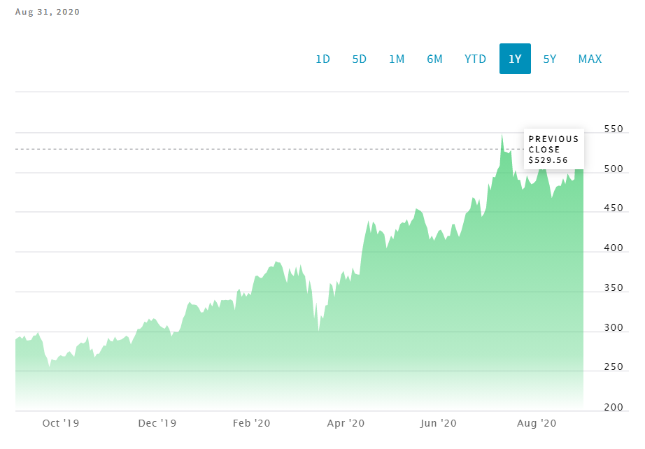 코로나 펜데믹의 영향으로 외출이 금지되고 넷플리스의 주가는 꾸준하게 상승하고 있습니다.