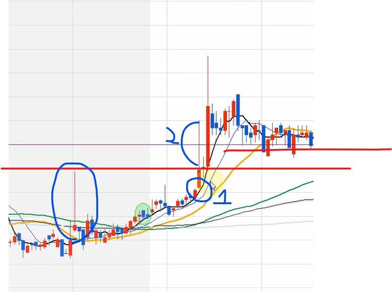 2. 윗꼬리 가격 돌파직전 매수 고려 (20일선과 이격도 확인) : 1번 위치
