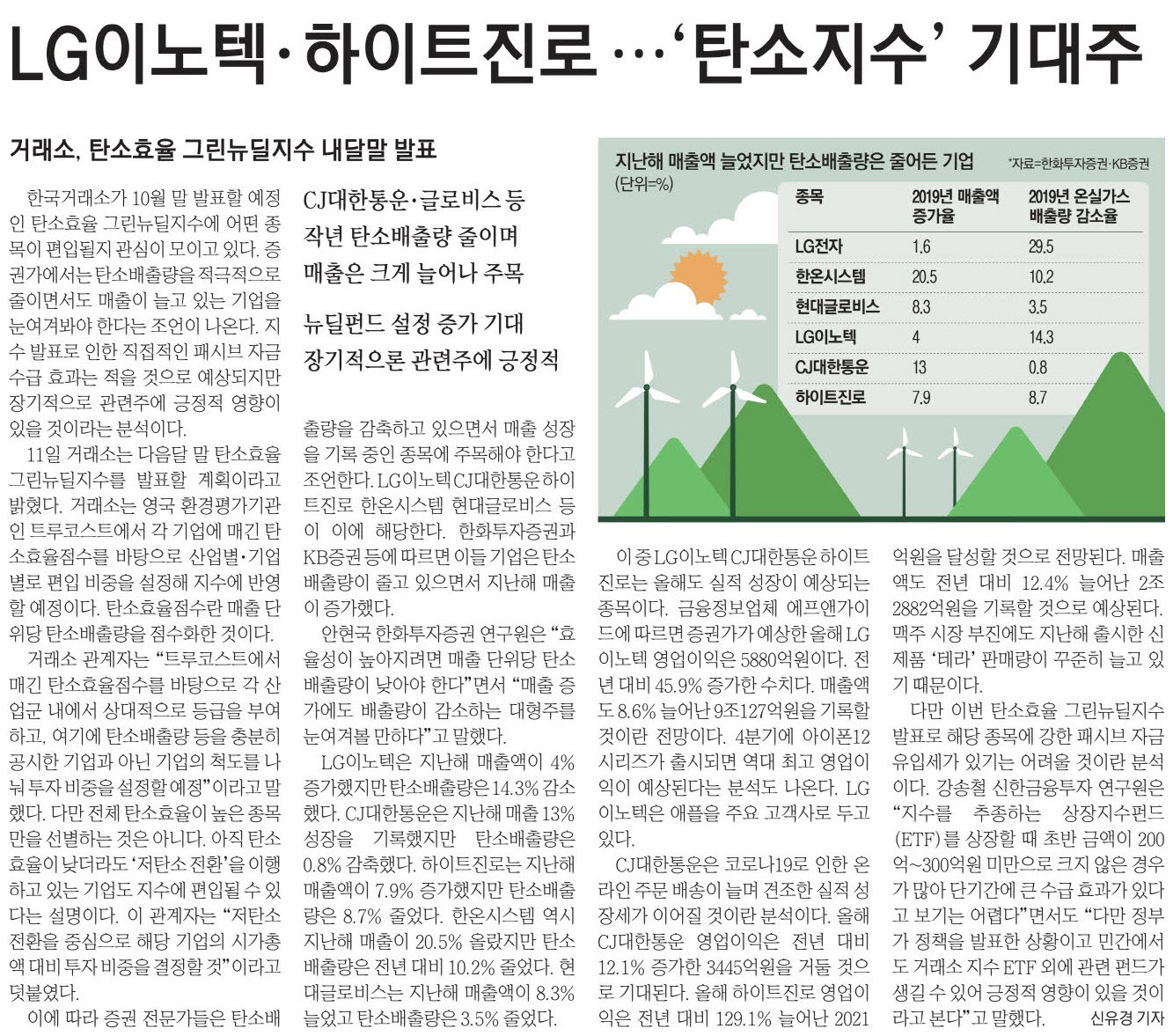 ▣ 그린뉴딜 지수에 포함될 회사들이 풍력,태양광,재생에너지 와 같은 테마보다는 저탄소 전환을 이행하고 있는 기업도 지수에 편입될 수 있다는 설명입니다. 매출 증가에도 배출량이 감소하는 대형주 LG이노텍, CJ대한통운, 한온시스템을 언급했습니다. 다만 상장지수펀드(ETF)를 상장할 때 초반 금액이 200~300억 원 미만으로 크지 않아 지수 변화에 급격한 변화를 주지는 못할 것이라고 전망했습니다.