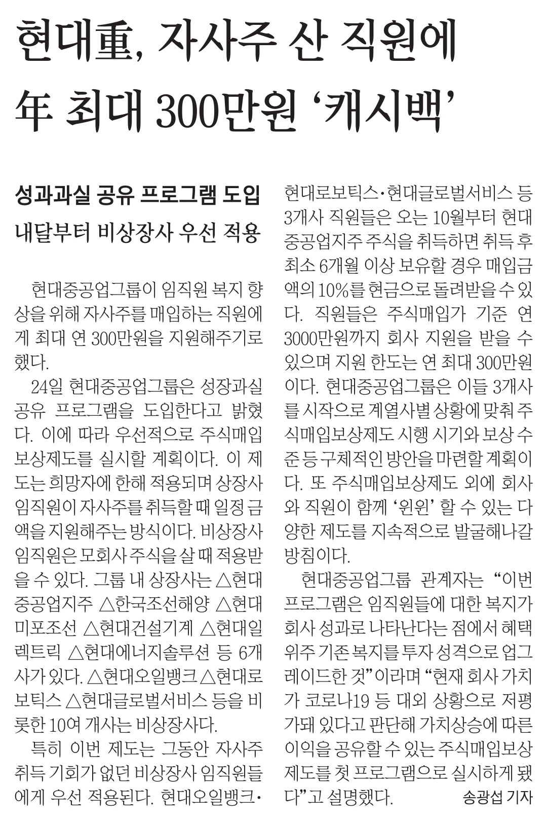 좋은 프로그램. 회사가 직원들을 위한 행동일까? 싼값에 주가 방어를 위한 꼼수일까? 어쨌던 현대중공업에 물길을 대긴 했지만 물이 흐를지는 지켜봐야 함