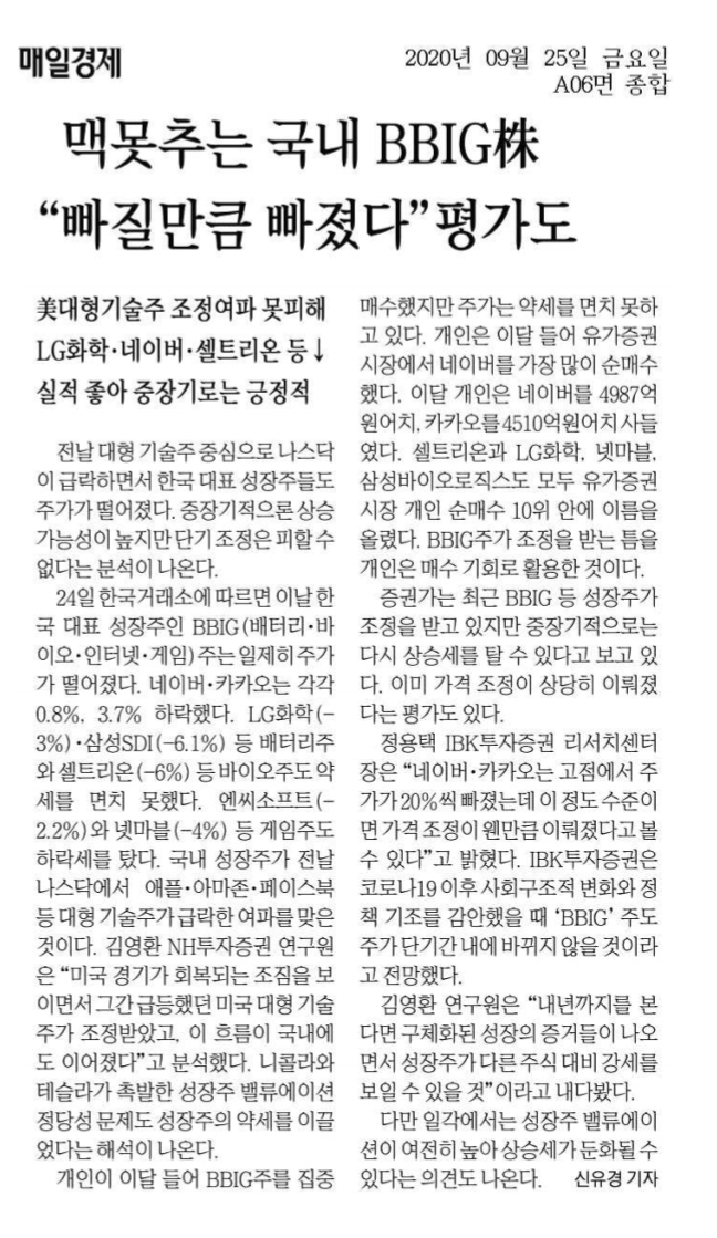 BBIG 기업들이 성장을 멈추지는 않았다. 가격 조정도 웬만큼 이뤄졌다고 볼 수 있다고 한다.