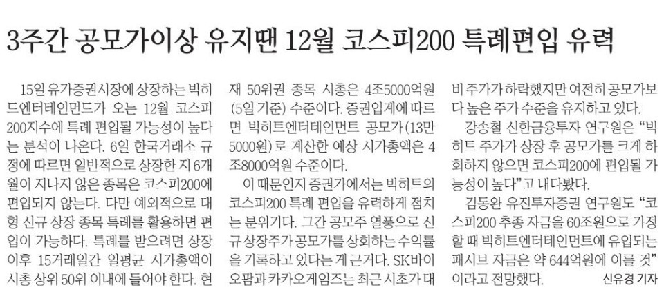 코스피200 추종 자금을 60조원으로 가정할 때 빅히트엔터테인먼트에 유입되는 패시브 자금은 약 644억원에 이를 것